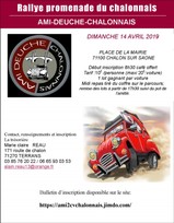 Titre de la sortie :rallye ballade chalonnaise Organisé par : AMI-DEUCHE-CHALONNAIS Où : CHALON SUR SAONE (71100) Tarifs : 10€/personne (maxi 20€ / voiture) Contacts : Marie claire REAU Tél : 03 85 76 20 22 /06 65 93 03 53 Email : alain.reau13@orange.fr | ![]() |